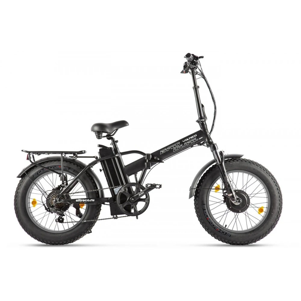Модель электровелосипеда VOLTECO BAD DUAL NEW самая компактная на всем потребительском рынке, черного цвета, с низкой посадкой. С первого взгляда похож на детский, но по всем своим характеристикам достаточно мощный и способный перевозить большой вес до 140 кг. Подходит для езды по городу, возвышенностям, для дачи, отдыха, для любителей быстрой и экстремальной езды, так как оснащен полным приводом.