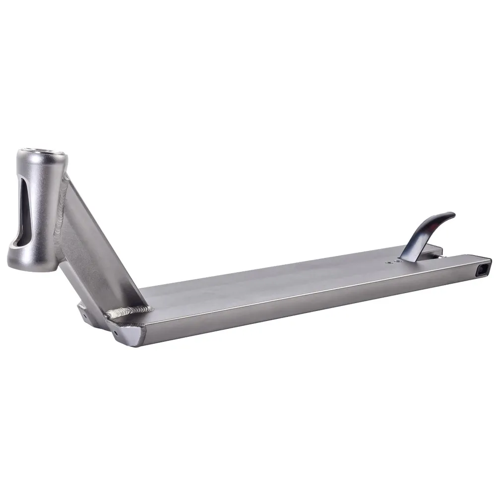 ДЕКА ДЛЯ ТРЮКОВОГО САМОКАТА CHOPPER серебристая – выглядит модно и шикарно, гарантирует отличное время провождение и безопасность при выполнении опасных трюков. Основной материал изготовления деки – термостойкий алюминий. Модель оснащена стаканами, угол наклона которых 83 градуса. Рассчитана на технику с колесами диаметром 110-120 мм. Хвостовая часть деки – квадратная, удобная при скольжении и маневрировании. Предлагаемый нами товар выглядит современно и привлекательно, сочетается с основным изделием. В комплектацию входит тормозная система и задняя ось со спейсерами. Чтобы заказать товар по приемлемой стоимости предлагаем связаться с нами сейчас.